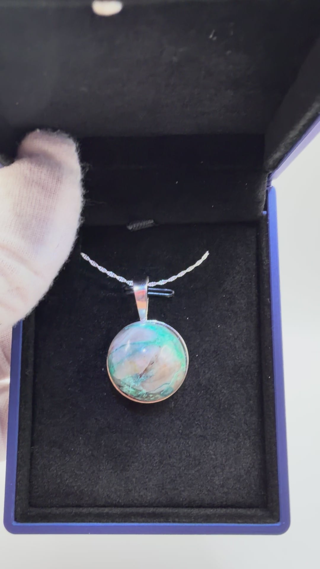 This 20mm Quantum Quattro pendant is handcrafted in Maine and set in sterling silver. It’s a natural Namibian mix of Shattuckite (deep blue), Chrysocolla, Malachite, Dioptase, and Plancheite all blended in quartz for that electric blue-green sparkle with green and coppery flecks. Known in crystal circles for communication, intuition, and emotional balance — a unique, everyday piece with lots of character.