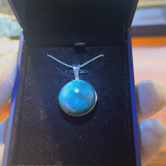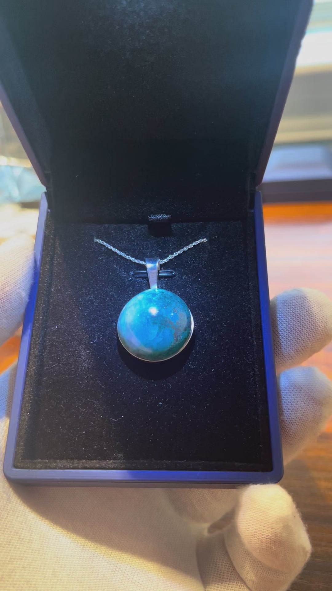This 39ct Chrysocolla/Shattuckite in Quartz pendant showcases a stunning blend of vibrant blue and green hues encased in clear quartz. Its unique natural patterns make each piece one-of-a-kind, perfect for adding a touch of elegance and individuality to your jewelry collection. Wear it to elevate any outfit with a captivating, earthy charm that draws attention and sparks conversation.1mm light 18" sterling silver double rope chain included .